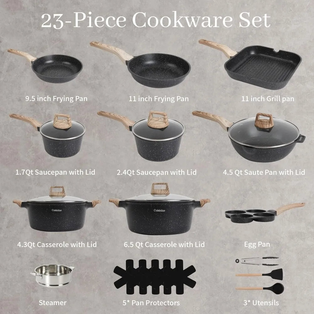 - ★ Complete 23-Piece Cookware Set for Every Kitchen Task - This all-in-one set has everything you need to master any recipe. It includes an 11" grill pan, multiple frying pans, saucepans with lids and a steamer, two casserole pots, a large sauté pan, 3 versatile utensils, and 5 pan protectors. Whether you're searing, simmering, boiling, or steaming, this set delivers the right tool for the job—perfect for home cooks and seasoned chefs alike.
