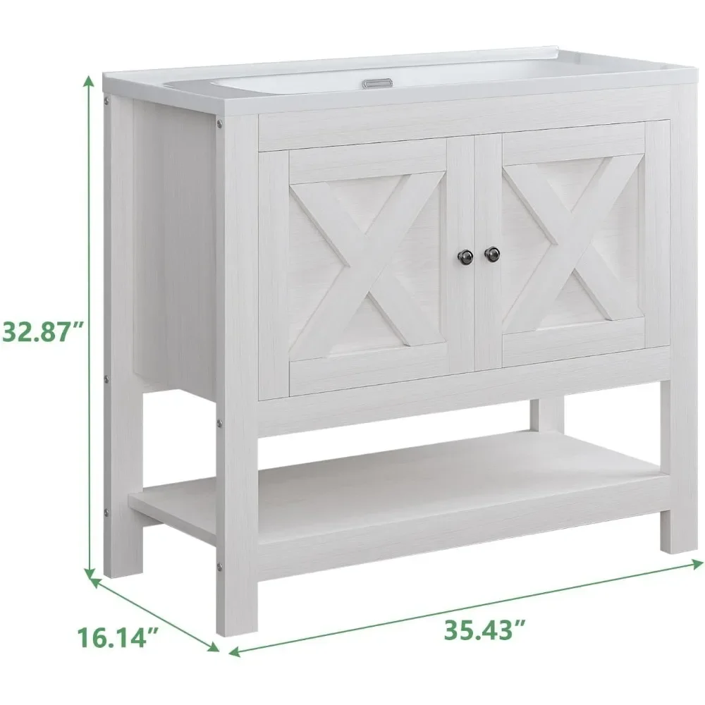 Farmhouse Bathroom Vanity with Sink, 35 Inch Bathroom Vanity Cabinet, Freestanding Vanity, 2 Doors and Open Shelf,