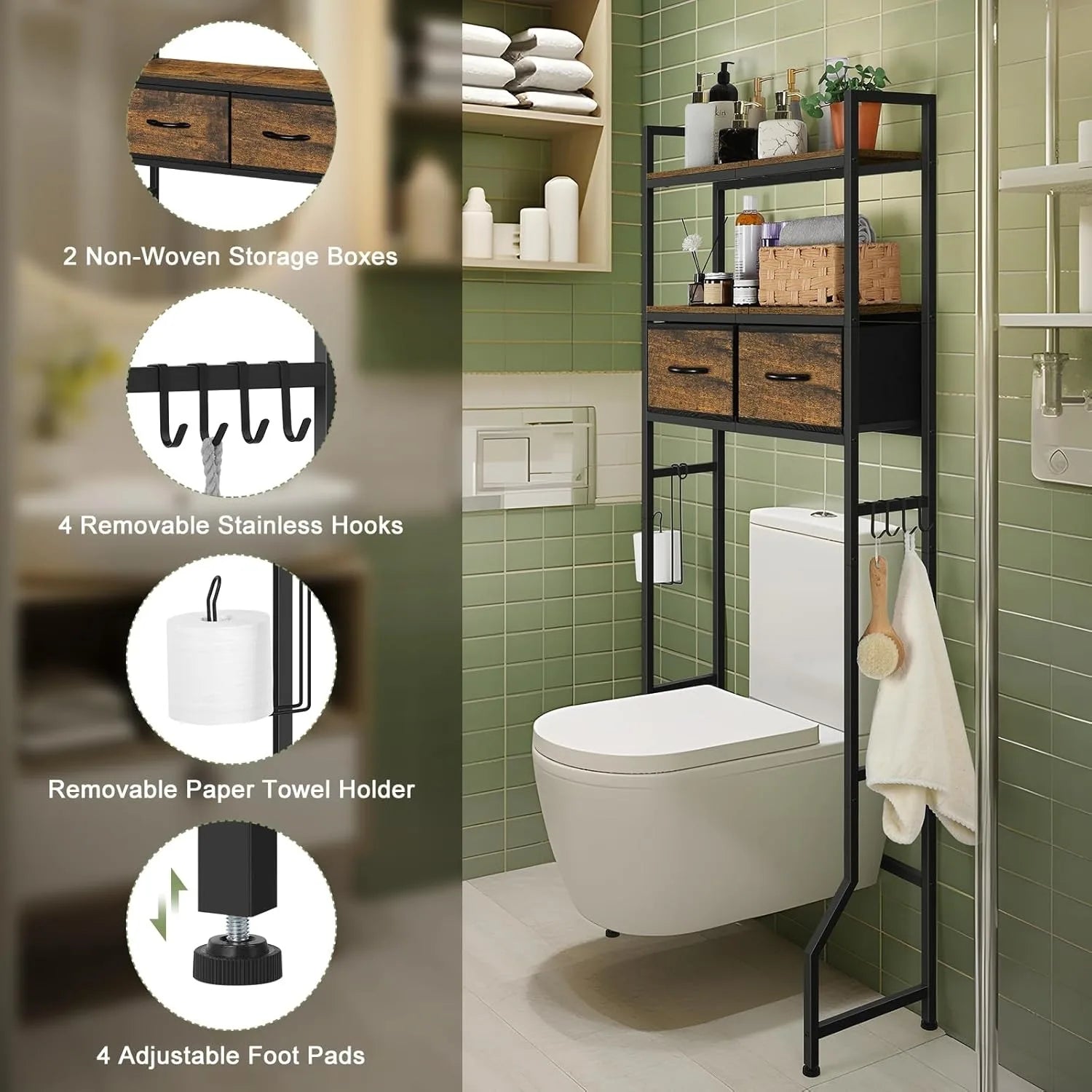 3-Tier Over Toilet Bathroom Organizer with 2 Fabric Drawers & 4 Hooks & Toilet Paper Holder